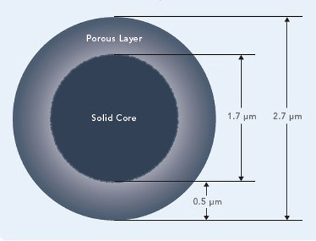 核殼顆粒是由著名色譜科學(xué)家 Jack Kirkland 教授于2006年研制成功的。“核殼型”填料最初是為了使UHPLC色譜柱比常規(guī)2μm填料UHPLC色譜柱更堅(jiān)固可靠。Fused-Core(核殼或熔融) 技術(shù)就是將多孔硅殼熔融到實(shí)心的硅核上面而制備出的。這些多孔的“光環(huán)”狀顆粒具有極小的粒徑分布和擴(kuò)散路徑,可以同時(shí)減小軸向和縱向擴(kuò)散,減小峰寬,提高柱效。核殼技術(shù)被證明非常有效,因此衍生了多種不同的品牌和固定相類別,成了HPLC和UHPLC中有力的色譜工具。